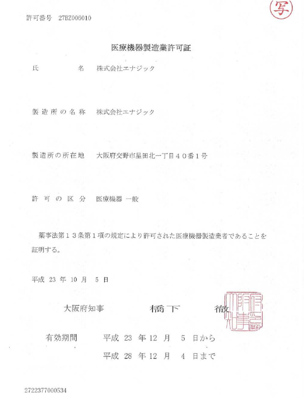 日本厚生省醫療機械生產認可証書