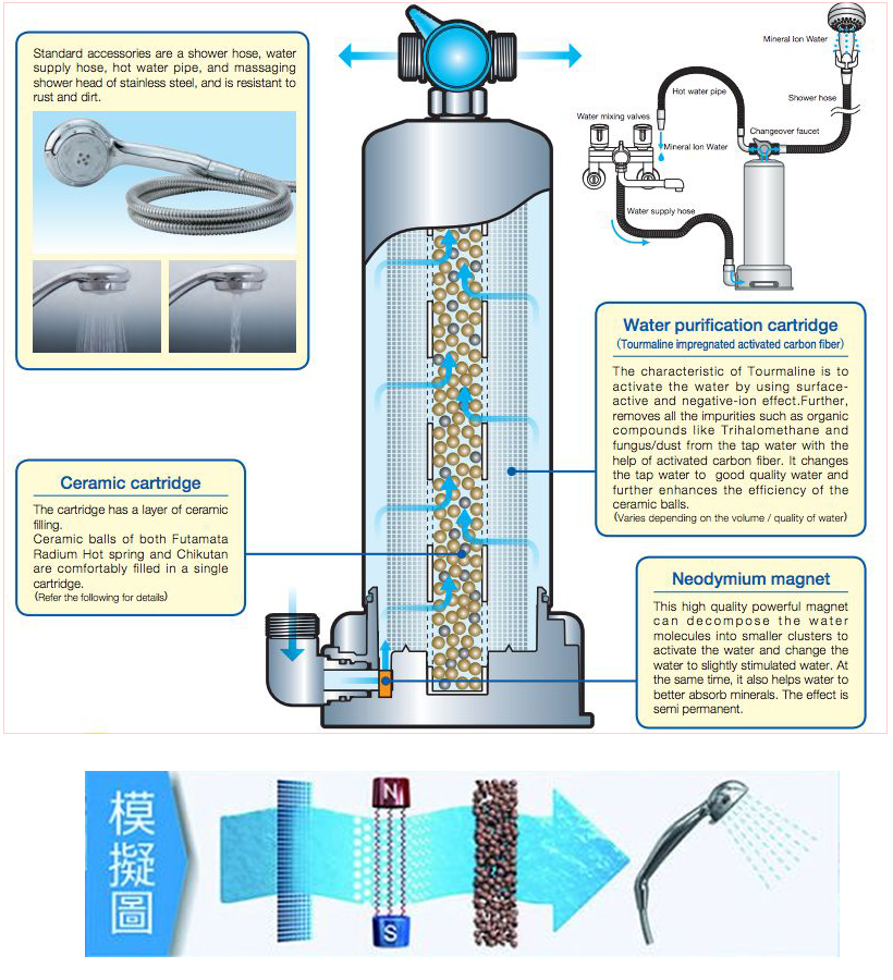 高品質的陶瓷濾芯淨化系統有效地去除了氯氣和細菌,為您帶來了清新,振奮的感覺。 保護您的細膩皮膚免受自來水的有害影響。使用活性炭過濾及二股鐳溫泉之石灰華製成的陶瓷內部過濾。