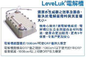 還原水®、美容水電解槽由5層鈦鍍白金電解板組成,強酸性、強鹼性電解槽由7層鈦鍍白金電解板組成,功能強大。能穩定生成ORP由+1130mV至-800mV之電解水(因選擇之生成水及自來水而不同)。