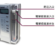 B) 內藏電解促進液箱可連續穩定地生成強酸性水 ( 外用 )、強還原水® ( 非飲用 )內藏電解促進液箱可方便穩定地連續生成強酸性水 ( 外用 )、強還原水® ( 非飲用 )。注入一次電解促進液(400g),約可生成10~15公升強酸性水 ( 外用 )。